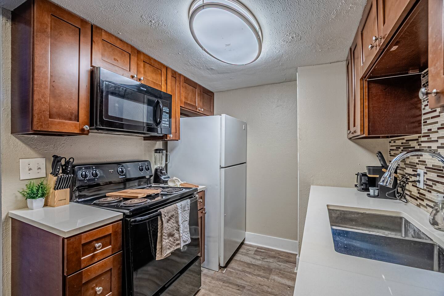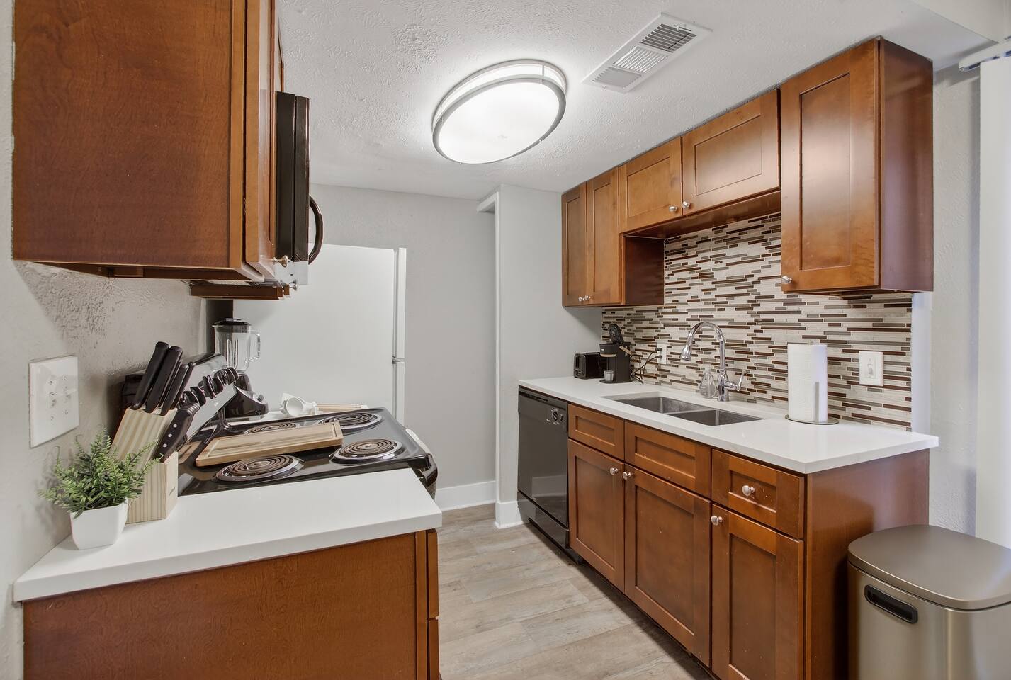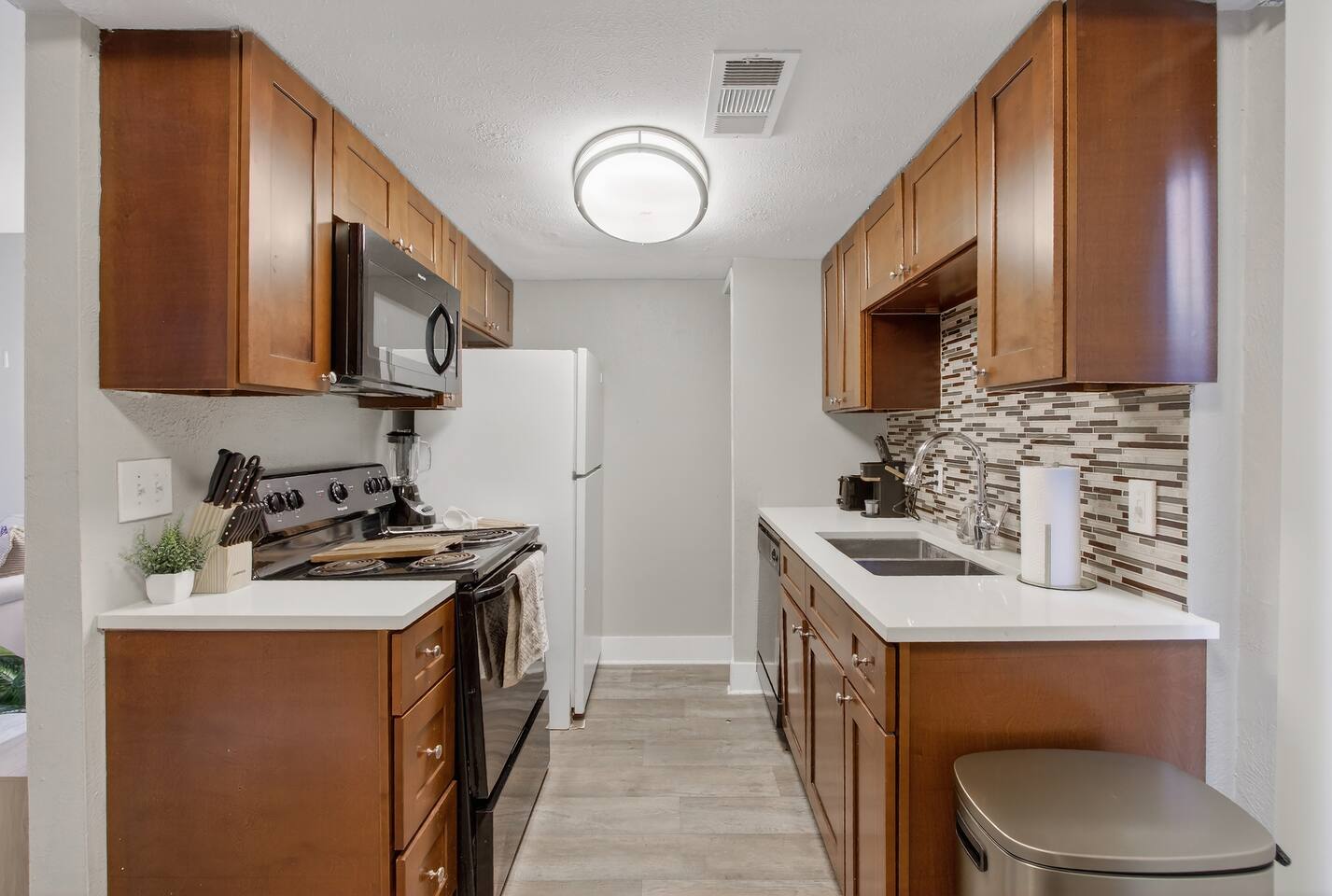 The comfortable living area is perfect for unwinding after a day of exploring, where you can stream your favorite shows on the smart TV. The fully equipped kitchen has everything you need to prepare a delicious home-cooked meal or a quick snack.